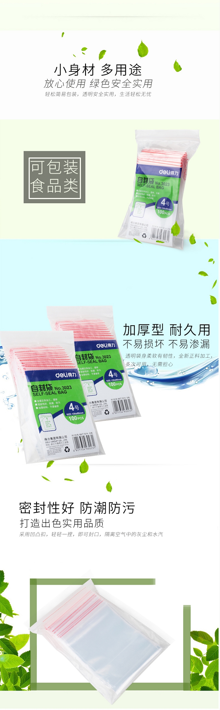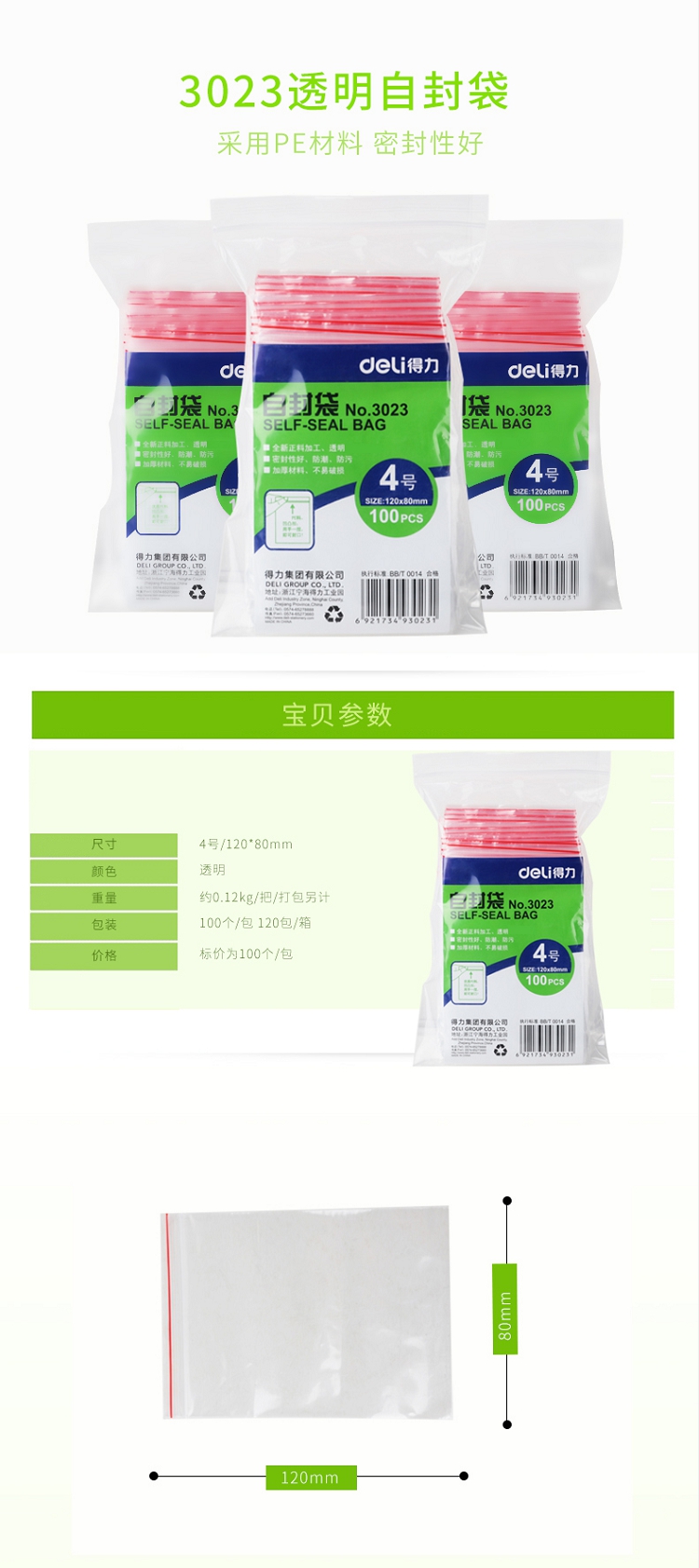 得力(deli) 3023 自封袋(透明)-4號(100個(gè)/包)120x85mm0.04mm