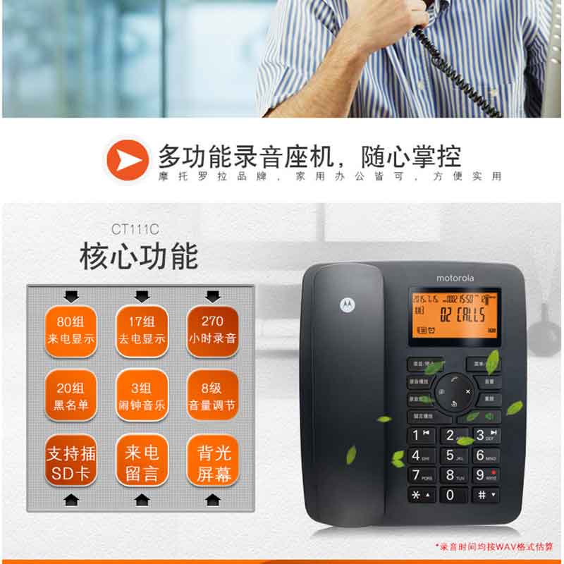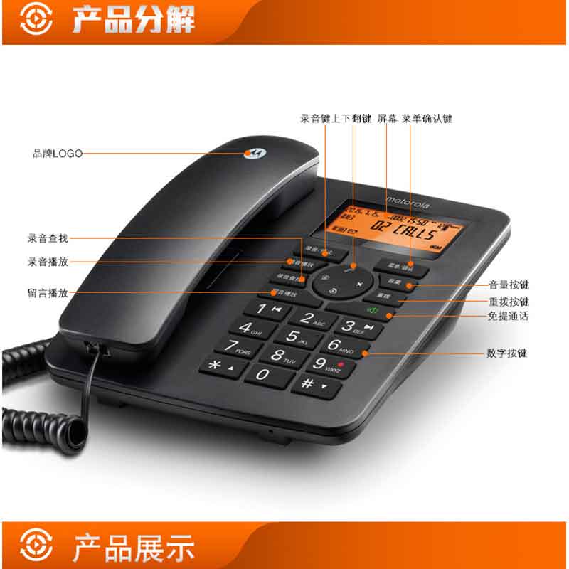 摩托羅拉(Motorola) CT111C 智能自動/手動插卡錄音電話機(jī)座機(jī)商務(wù)客服電話呼叫中心家用辦公固定座機(jī) (白色)